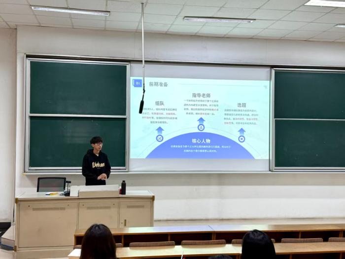 在經(jīng)驗分享環(huán)節(jié),往屆獲獎學生代表王碩學長從實踐角度出發(fā),介紹了比賽各環(huán)節(jié)的具體實施要點。他結(jié)合自身參賽經(jīng)歷,重點講解團隊協(xié)作、調(diào)研設計和數(shù)據(jù)分析等方面的經(jīng)驗,并提醒同學們注意比賽中容易出現(xiàn)的細節(jié)問題,為在座同學提供了實用參考。