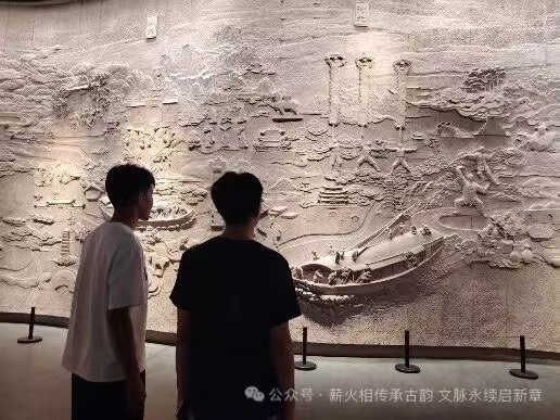 第二站團隊前往滄州,在滄州市大運河博物館開展實踐。這座以“運河文化”為核心的場館,通過“千年運河”“漕運記憶”“精神傳承”三大展區,運用文物陳列、多媒體互動、場景復原等技術,全方位呈現大運河的歷史脈絡與文化價值。團隊首先在“千年運河”展區參觀,近距離觀察唐代船型陶俑、宋代運河磚、明清漕運賬簿、民國沿岸商號印章等200余件文物,通過文物年代、用途的梳理,繪制出“大運河漕運發展時間軸”,清晰掌握不同朝代運河的功能演變——從唐代的軍事運輸為主,到宋代的南北物資交流核心,再到明清時期成為“國家經濟生命線”的轉變過程。在“漕運記憶”展區,團隊體驗了多媒體互動項目“漕運船員的一天”,通過模擬駕駛漕船、裝卸貨物、與沿岸商戶交易等場景,直觀感受古代漕運人員的工作艱辛與智慧,有成員在體驗后表示“以前只知道運河是‘黃金水道’,卻不知道船員要應對水情變化、貨物管理、多方協調等多重挑戰,這讓我對‘工匠精神’有了更具體的理解”。隨后,在“精神傳承”展區,團隊結合展區對運河橋梁建造技藝、漕運商號經營理念、沿岸民俗融合的展示,分組提煉大運河所蘊含的文化精神:工程組聚焦工匠們為解決運河水位差問題而發明的“水閘技術”,總結出“精益求精、攻堅克難”的工匠精神;商貿組通過分析漕運商號“誠信經營、跨區域合作”的案例,提煉出“開拓進取、互利共贏”的發展勇氣;文化組則從運河沿岸戲曲、飲食、節慶的融合現象,歸納出“開放包容、多元共生”的文化胸懷。參觀結束后每位成員結合自身參觀重點與感悟發言,進一步深化對運河文化精神的認知。
