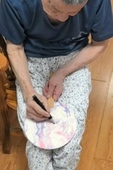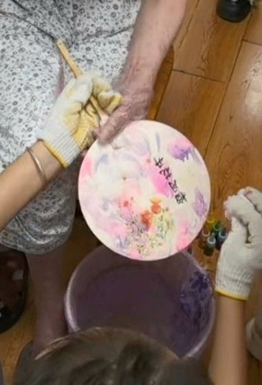 巧手繪漆扇第二天上午的活動(dòng)現(xiàn)場(chǎng)格外熱鬧。志愿者們發(fā)揮專業(yè)特長(zhǎng),帶來非遺漆扇制作體驗(yàn)。不追求完美成果,只享受創(chuàng)作過程——這個(gè)理念讓老人們放松地拿起顏料,隨意的滴在水桶里。87歲的陳奶奶做一把帶有荷花配色的扇子,“年輕時(shí)最喜歡荷塘的清香”,她笑著說。活動(dòng)結(jié)束后,每把漆扇都被細(xì)心標(biāo)注創(chuàng)作者姓名,拍照留念。