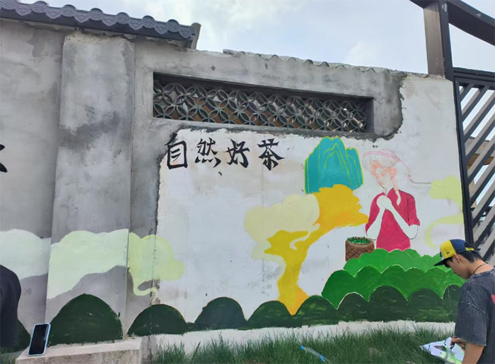學子與村民共繪,文化賦能產業振興活動過程中,學生們與濮塘村村民緊密協作。村民提供創作場地、分享茶文化故事,學生則用專業技藝將故事轉化為視覺藝術。村民李阿姨感嘆:“這些大學生畫的茶山就像我們每天生活的樣子,又比現實更漂亮,以后咱們村肯定能吸引更多客人來買茶葉!”墻繪不僅美化了村容村貌,更成為茶產業宣傳的“活廣告”,助力濮塘村茶品牌“走出去”。