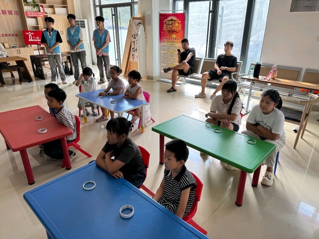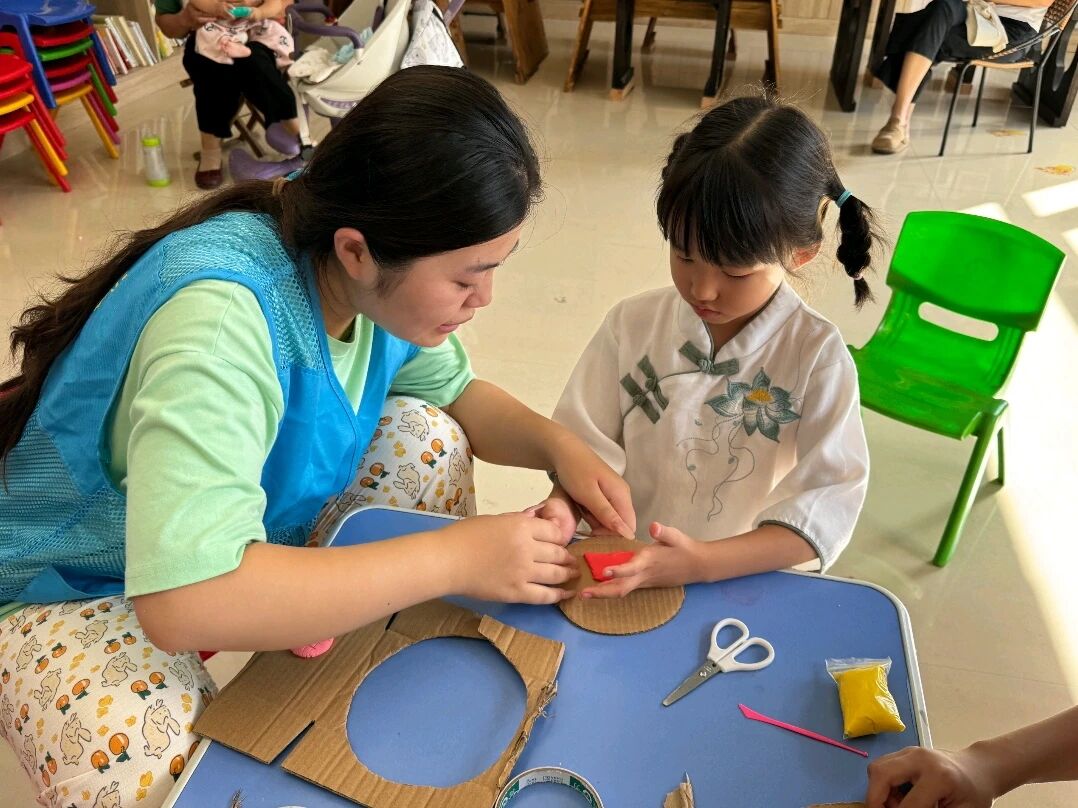 手工制作環節,在志愿者的耐心指導下,小朋友們用硬紙板剪出圓形、星形等底板,利用黏土捏出火箭、衛星等代表著祖國輝煌成就的造型,將自己對“兩彈一星”精神的理解融入作品之中,表達對祖國的熱愛與祝福,最終制作出一個個獨一無二的冰箱貼,現場歡聲笑語不斷。