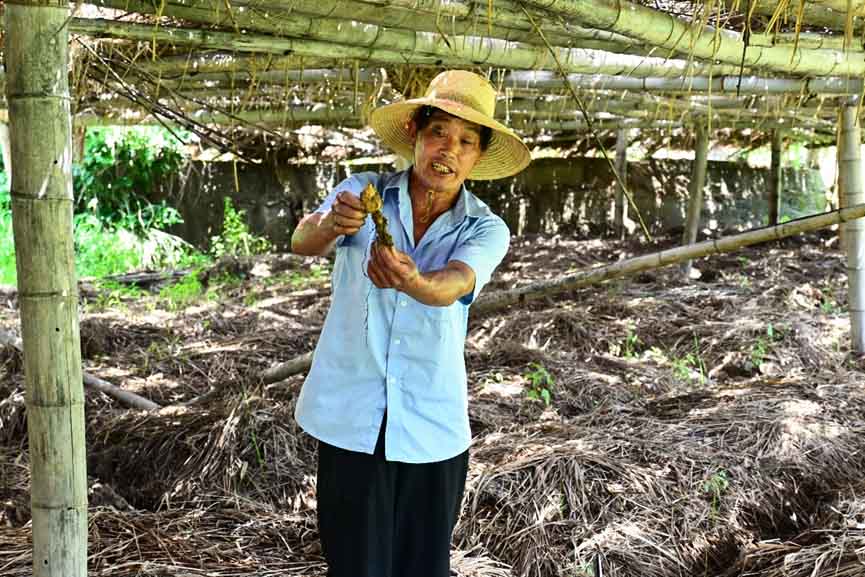 沿著蜿蜒的田間小道,團隊走進連片的天麻種植基地。遮陽網下,腐殖土覆蓋的菌床整齊排列,濕潤的空氣里彌漫著草本植物的清香。當地村民大叔現場演示天麻采挖過程:“天麻靠蜜環菌提供養分,挖的時候要順著菌索找,不能傷了菌絲。”隨著覆土輕輕撥開,一顆紡錘形的新鮮天麻露出褐色表皮,肉質飽滿的塊莖上還附著濕潤的泥土。