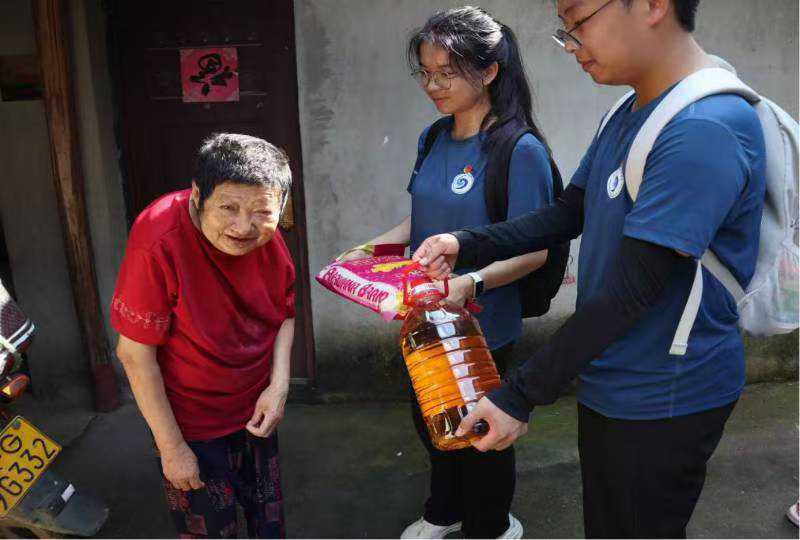 離開劉倩家,實踐隊員們沿著蜿蜒的村道來到胡樹根奶奶家,到達低矮的土坯房,胡奶奶看到我們時露出孩童般的笑容。當實踐隊員把米和油遞到她手中時,她懵懂地咯咯笑起來,笑容帶著孩童般的純真。