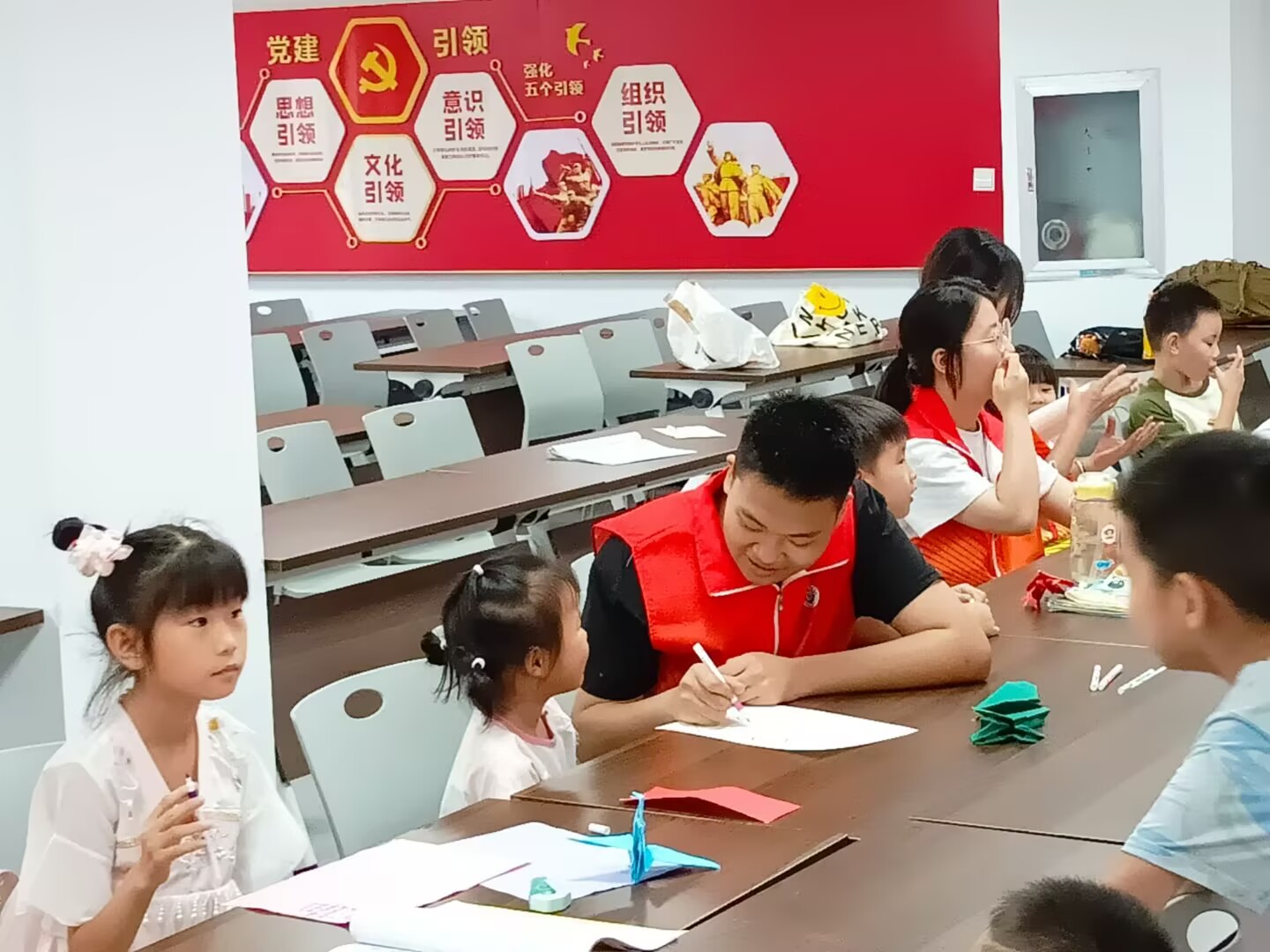 活動現(xiàn)場,志愿者們有序開展課業(yè)輔導(dǎo),幫助孩子們鞏固知識。隨后的特色課程環(huán)節(jié)精彩紛呈:在紅色教育課堂,孩子們聚精會神聆聽黨的光輝歷程,當(dāng)志愿者拋出互動問題,一雙雙小手迅速舉起,“我知道!黨就像太陽,照亮我們!”“我長大也要像革命先輩一樣勇敢!”稚嫩而堅定的回答,讓紅色精神在熱烈的討論中悄然生根。