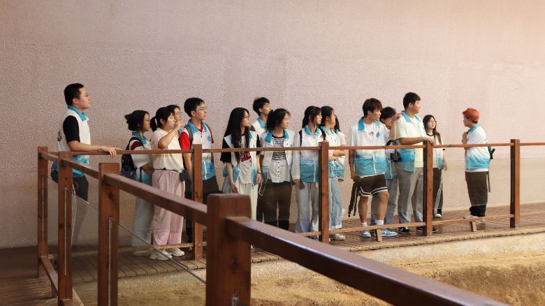 接下來,隊員們在講解員的帶領下實地觀察了城頭山古城墻遺址。經講解得知古城墻歷經四期修筑,城墻夯土層清晰的分界線,展示了古代筑城技術的演進。考古學家采用橫斷面剖切和標注地層分界線的方式,將城墻的夯土結構清晰展示,反映了古城在不同歷史階段的興衰變遷。