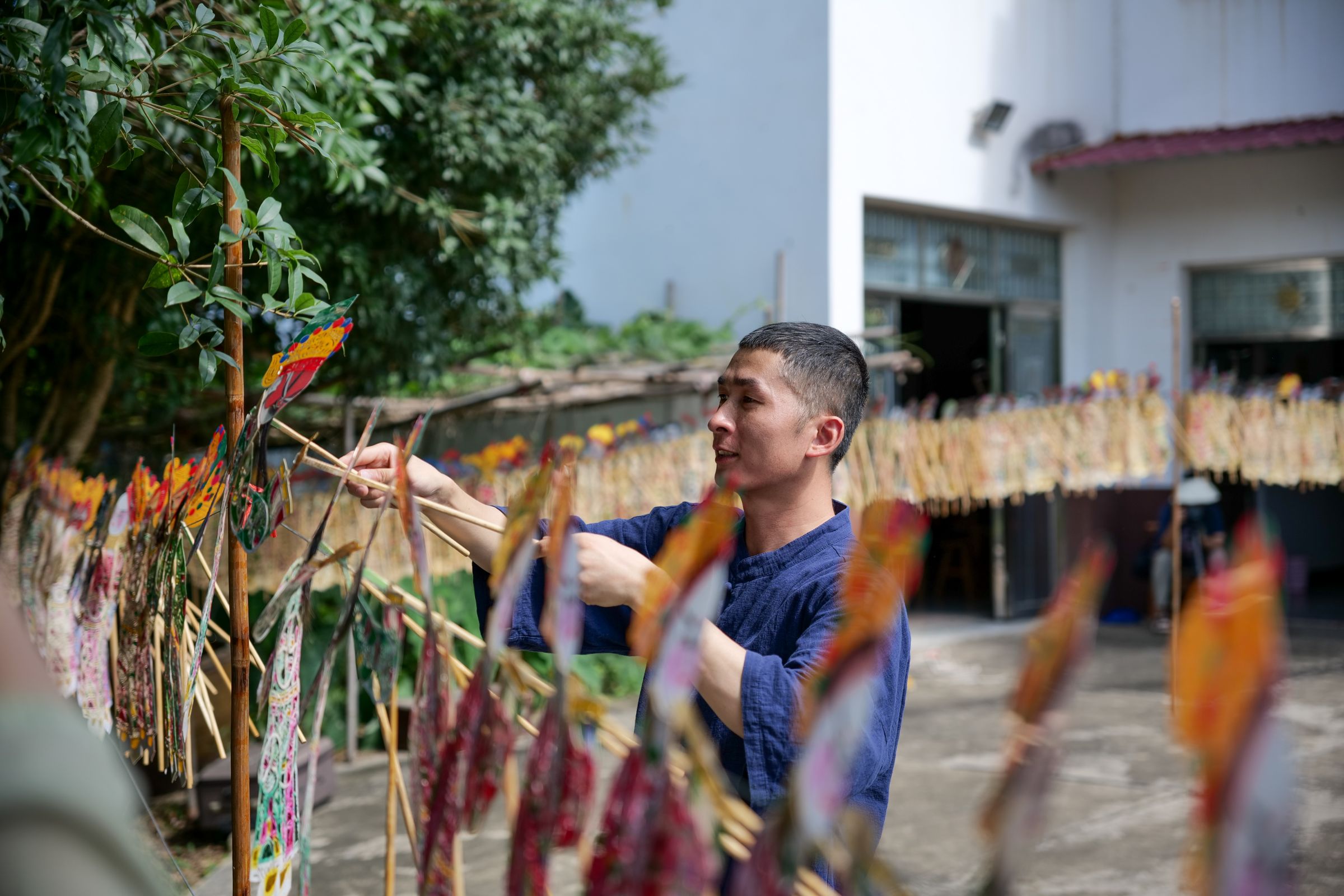調研團隊抵達博物館時,恰逢一年一度的傳統曬皮影日。在鋪滿庭院的皮影作品前,團隊成員與湖南省省級非遺傳承人吳升平先生展開深度訪談。鏡頭中,吳升平老人端坐其間,輕撫著一件紙影作品,與團隊成員進行交流。吳老向團隊成員講述了紙影的歷史、制作工藝以及他和紙影的故事,字字句句中都透露著作為傳承人的擔當精神和對紙影這門非遺的熱愛,時光流逝的痕跡依然遮不住這位老人眼里的光。
