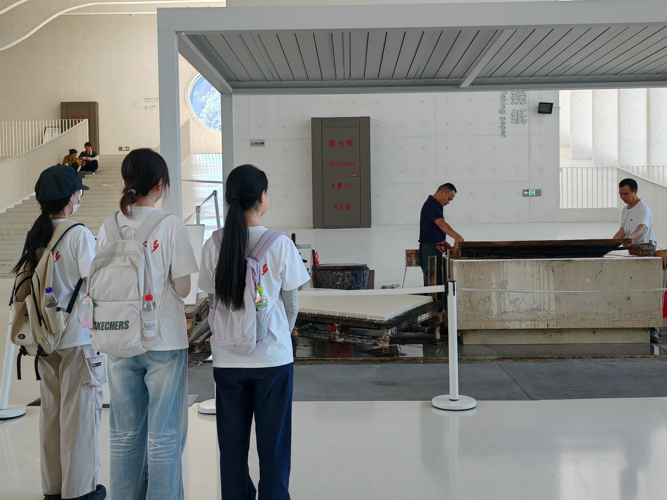 抵達宣紙文化園后,同學們首先被園區現代化的建筑風格與濃厚的文化氛圍所吸引。隨后,團隊移步至中國宣紙博物館。館內陳列著從唐代至現代各時期的宣紙珍品,泛黃的古紙、名家書畫真跡、歷代制紙工具等一一陳列,仿佛翻開了一部宣紙的“活歷史書”。在互動展區,學生們通過高清投影與觸摸屏幕,動態觀看了宣紙“選料、制漿、撈紙、曬紙、剪紙”等108道工序,讓大家深刻感受到“一張宣紙,百道工序”背后,匠人傾付的耐心、專注與執著,那是流淌在歲月里,代代相傳的匠心精神。
