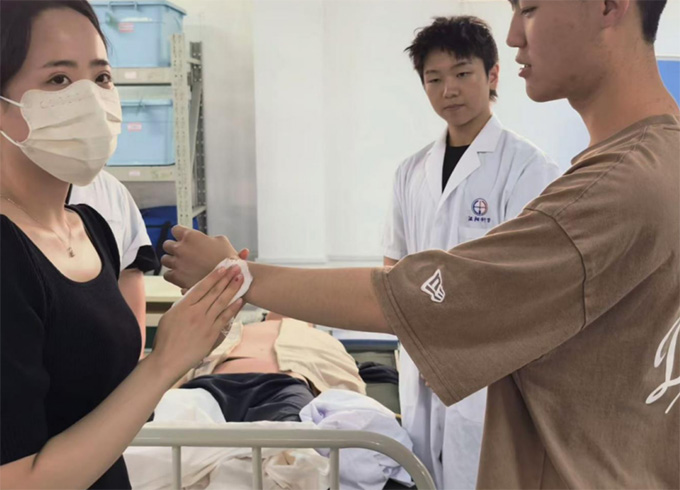 實踐團成員分組進入外科換藥室與急診科學習,在外科換藥室,醫護人員結合兒童常見創傷案例,詳細講解了“八字纏繞法”等包扎技巧的操作要點:關節處傷口先覆無菌紗布,再以繃帶‘8’字形交叉纏繞,松緊度以插入一指為宜,兼顧止血與血液循環。成員們兩兩一組,用模擬傷口模型反復練習,醫護人員在旁細致指導,不時糾正纏繞角度、力度等細節。李朔杰在操作時,因第一圈斜度沒掌握好導致繃帶松動,護士當即示范調整:“順著關節弧度纏才穩。”他練習后感慨:“原以為簡單,實操才知細節關鍵,多虧老師指導。”