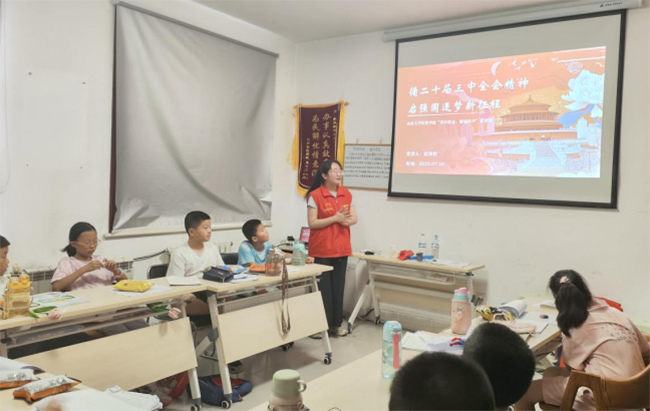 午后蟬鳴穿窗而入,屋內窗簾濾去暑氣,涼意漫過膝頭。化纖社區二樓的活動室內,孩子們正圍在一起指著屏幕上的“二十屆三中全會”字樣,眼睛里盛滿好奇。我揚了揚宣講手冊,笑著說:“今天我們就搭上這趟‘會議時光機’,去看看黨的三中全會如何改變中國。”