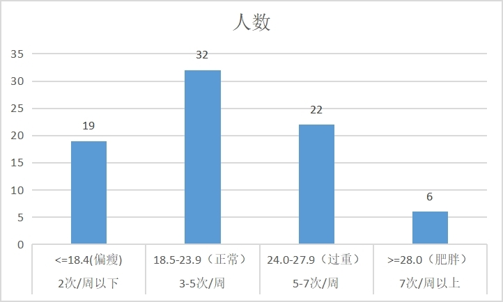 上圖可知,過多飲用含糖飲料的人,BIM指數大于24.0。因此,飲用含糖飲料的次數與肥胖人群的數量存在一定的相關性。若不能及時消耗攝入過量的糖分,可能會促進脂肪的儲存,進而引發肥胖的健康問題。