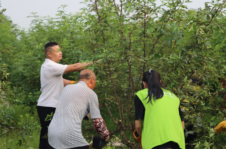 (禾豐鎮和平村黨支部副書記喻安建、隊長李秀萍與農民伯伯一起采摘花椒)
