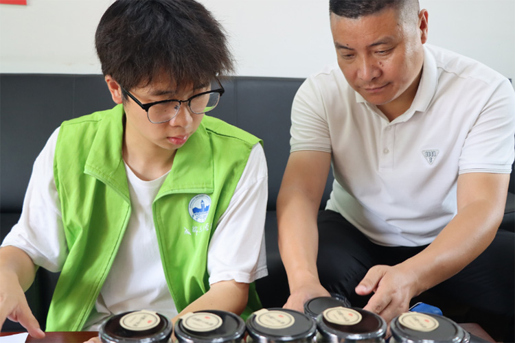 (隊長鄒磊與禾豐鎮和平村黨支部副書記喻安建進行青花椒裝罐)