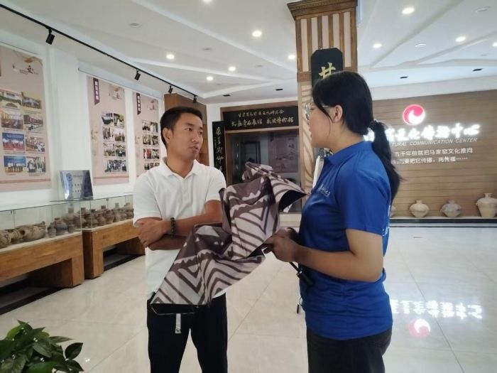 (實踐隊員向甘肅省彩陶文化博物館王勇主任介紹馬家窯彩陶文創(chuàng)。范凱妮攝)