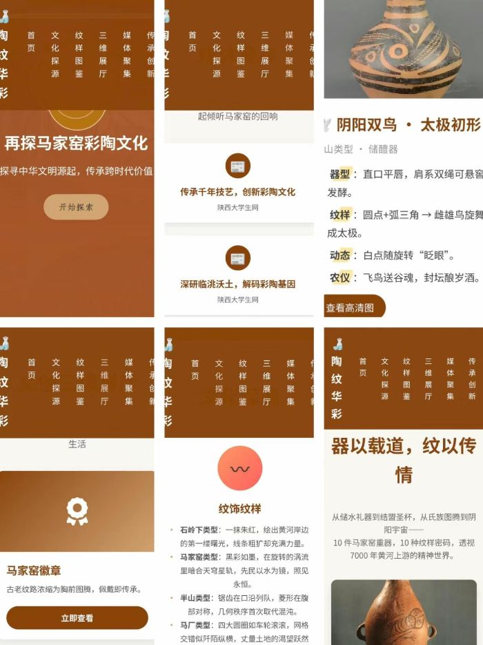 數(shù)字化傳承:創(chuàng)建“陶紋華彩”網站 為了進一步擴大馬家窯文化的影響力,實踐隊員還搭建了一個名為“陶紋華彩”的網站。該網站不僅作為此次實踐活動的成果展示平臺,更是一個集文化、教育和互動為一體的數(shù)字空間。網站設有“文化探源”、“紋樣圖鑒”、“三維展廳”、“媒體聚焦”和“傳承創(chuàng)新”等多個板塊。訪問者可以深入了解馬家窯文化的起源與發(fā)展,欣賞詳細的紋飾圖樣,甚至通過三維技術“親臨”虛擬展廳,沉浸式體驗馬家窯彩陶的藝術魅力。