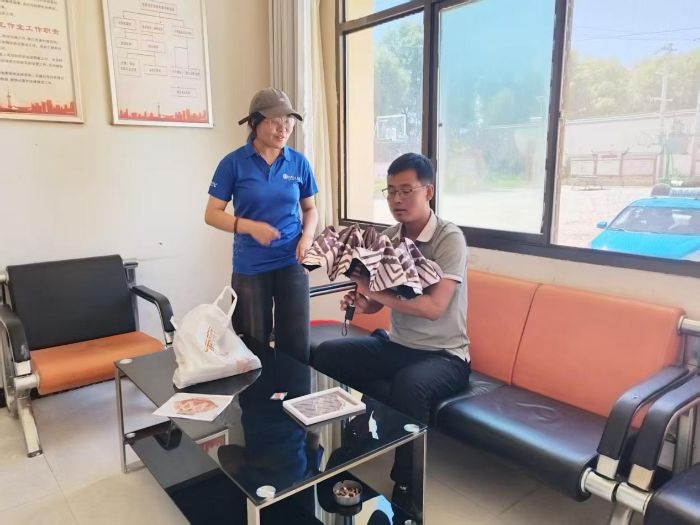 (實踐隊員向馬家窯村黨支部書記丁書記介紹文創(chuàng)。范凱妮攝)