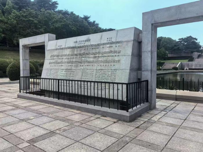 沿著中軸線往前走,雨花臺烈士紀念碑在陽光下愈發顯得巍峨。仰頭望去,紀念碑直插云霄,碑體上“雨花臺烈士紀念碑”八個鎏金大字在陽光下閃著光,像一團不會熄滅的火焰。繞到碑后,國際歌照壁上的文字在倒影池中漾起細碎的波光,字影交融間,仿佛能聽見跨越時空的歌聲。