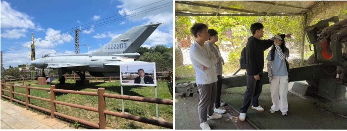 移步至園區(qū)軍事設(shè)施、掩體和炮戰(zhàn)遺址參觀學(xué)習(xí)點(diǎn)。一架戰(zhàn)機(jī)率先映入眼簾,沉默卻有力地拉開歷史帷幕。接著隊(duì)員們近距離觀察舊時裝備、探尋戰(zhàn)斗痕跡,了解坦克、火炮等。