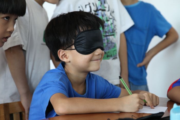 圖為一名小朋友在另一名小朋友的語言引導(dǎo)下蒙眼作畫 王崎宇 攝