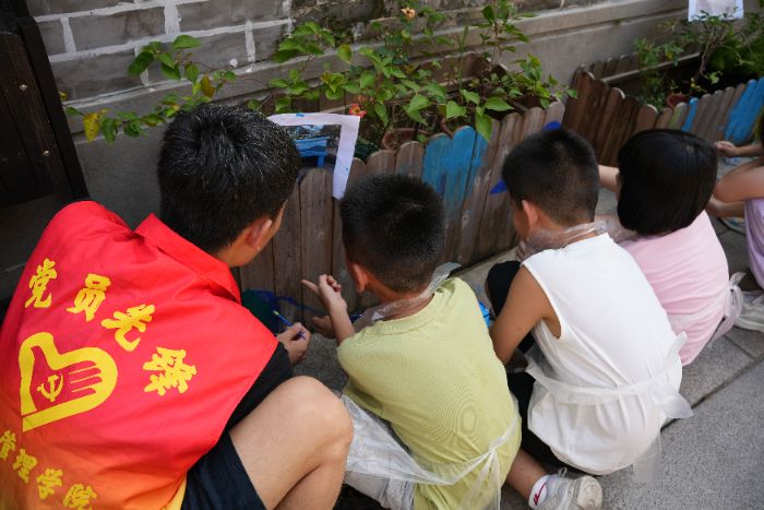 ▲孩子們在團隊成員們的帶領(lǐng)下認真地繪制文明小貼士