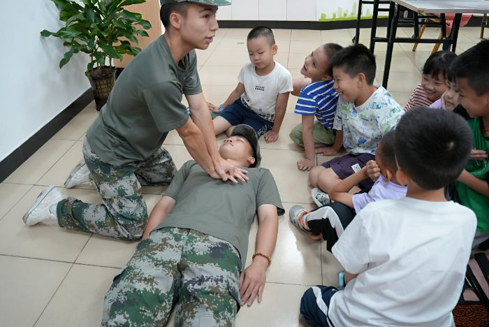 國防教育課程以趣味互動厚植家國情懷。急救知識培訓(xùn)提升孩子們的自我保護能力;軍事趣味訓(xùn)練通過隊列練習(xí)、障礙挑戰(zhàn)等游戲,培養(yǎng)紀律性與團隊精神;軍歌學(xué)唱和寫信擁軍活動,則讓孩子們在歌聲與文字中表達對軍人的敬意,激發(fā)愛國熱情。