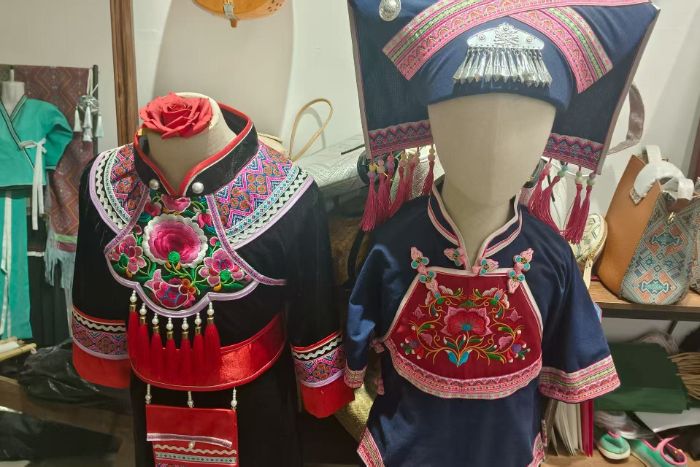 實(shí)踐期間,志愿隊(duì)以薩瑪非遺生活館為重要調(diào)研陣地,對(duì)傳承人洛塵老師展開(kāi)深度采訪。洛老師為柳州市非物質(zhì)文化遺產(chǎn)項(xiàng)目侗族大歌第五代傳人、薩瑪非遺生活主理人,在民族文化傳承領(lǐng)域積累了豐富經(jīng)驗(yàn)。交流中,志愿隊(duì)成員圍繞壯族服飾展開(kāi)細(xì)致探究,從款式色彩的搭配邏輯到裝飾紋樣的文化隱喻,深入挖掘“稻穗紋”象征豐收祈愿、“蝴蝶紋”承載民族創(chuàng)世記憶與感恩自然等文化內(nèi)涵。洛老師同時(shí)分享了壯族服飾背后的民間傳說(shuō):古代壯族先民借衣襟紋樣傳遞御敵信息,形成“密碼式”刺繡;百褶裙褶皺數(shù)量與女子勤勞程度掛鉤,使服飾成為民族精神的鮮活載體。通過(guò)交流,成員對(duì)服飾與民族歷史、信仰的深層聯(lián)結(jié)形成認(rèn)知。