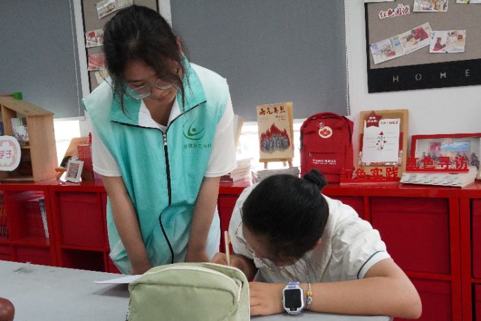 圖為團隊成員協(xié)助社區(qū)孩子完成預(yù)防侵害手冊。 裴春蕾 陳天樂供