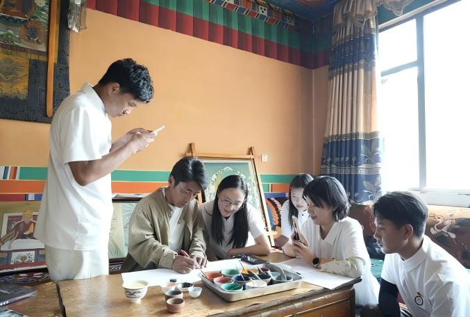 墨竹工卡縣是國家鄉(xiāng)村全面振興工作聯(lián)系點(diǎn),實踐團(tuán)追尋墨竹工卡縣紅色印記,參觀赤康村黨建基地,深入了解鄉(xiāng)村振興發(fā)展歷程,感受紅色文化底蘊(yùn);走訪格桑花開產(chǎn)業(yè)園、凈土產(chǎn)業(yè)園,調(diào)研現(xiàn)代產(chǎn)業(yè)與民族傳統(tǒng)融合創(chuàng)新模式,通過實地參觀、生產(chǎn)體驗等多種形式,全面了解縣域產(chǎn)業(yè)結(jié)構(gòu)、發(fā)展模式及創(chuàng)新舉措,感受鄉(xiāng)村振興豐碩成果。隊員們結(jié)合數(shù)字經(jīng)濟(jì)專業(yè)知識,為當(dāng)?shù)禺a(chǎn)業(yè)數(shù)字化轉(zhuǎn)型升級、電商渠道拓展和特色品牌打造提供新思路和建議。實踐團(tuán)還前往墨竹工卡縣扎雪鄉(xiāng)龍珠港村,拜訪青年唐卡畫師尼瑪次仁,沉浸式開展唐卡非遺研學(xué)。隊員們發(fā)揮專業(yè)特長,為唐卡錄制普通話推介視頻,以新傳媒技術(shù)助力藏地非遺文化傳播,傳承文化瑰寶。