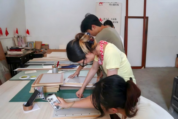 團隊成員正在對畫作裝裱 徐譽暢攝