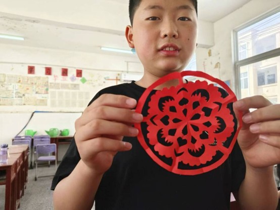 圖2 孩子與他的剪紙作品(宋竟博供圖)