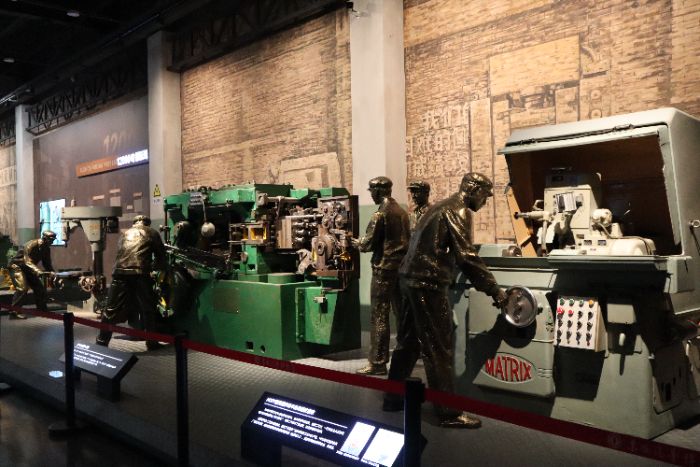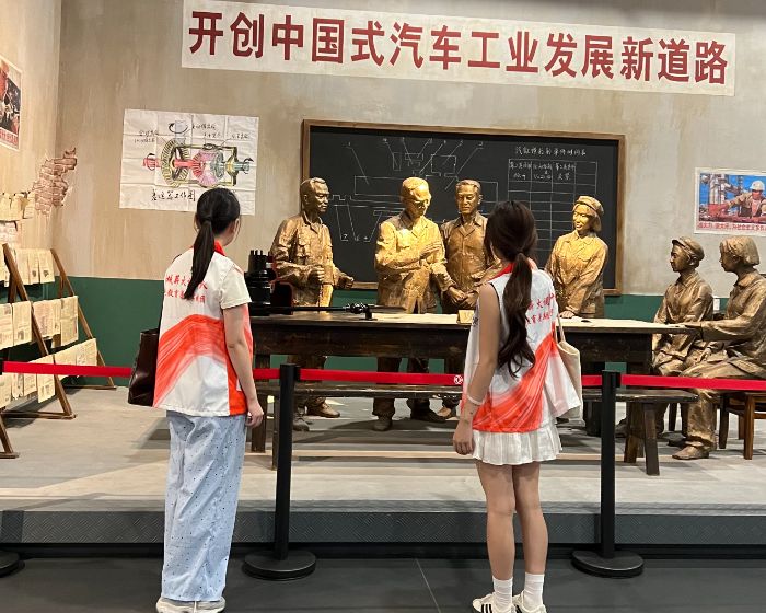 博物館內(nèi),調(diào)研隊(duì)員們環(huán)繞卡車(chē),觸摸車(chē)身,仿佛能感受到當(dāng)年建設(shè)者們的溫度。從資料中隊(duì)員們了解到,東風(fēng)汽車(chē)誕生于三線(xiàn)建設(shè)時(shí)期,無(wú)數(shù)建設(shè)者響應(yīng)國(guó)家號(hào)召,從五湖四海奔赴十堰這片深山,在艱苦環(huán)境中披荊斬棘,開(kāi)啟汽車(chē)制造事業(yè)。工人操作機(jī)床的銅像,生動(dòng)還原了當(dāng)年熱火朝天的創(chuàng)業(yè)場(chǎng)景,隊(duì)員們駐足凝視,深刻體會(huì)到先輩們“干驚天動(dòng)地事,做隱姓埋名人”的奉獻(xiàn)精神。