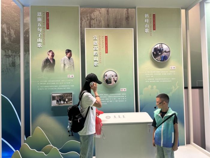 當(dāng)天下午,團(tuán)隊(duì)到達(dá)恩施州非遺館,走進(jìn)一幅流動(dòng)的山水人文長(zhǎng)卷。館內(nèi)陳列以“山·水·人·文”為脈絡(luò),系統(tǒng)展示了恩施地區(qū)從商周時(shí)期至今的非遺發(fā)展歷程。圖文并茂的展板、實(shí)物展示與數(shù)字技術(shù)相結(jié)合,生動(dòng)再現(xiàn)了土家族擺手舞的恢宏場(chǎng)面、《龍船調(diào)》的悠揚(yáng)旋律、“竹枝詞”的文學(xué)韻味,以及哭嫁歌、撒葉兒嗬等濃郁民族風(fēng)情的生活禮儀。
