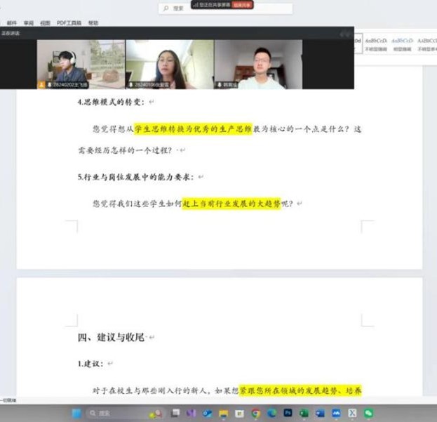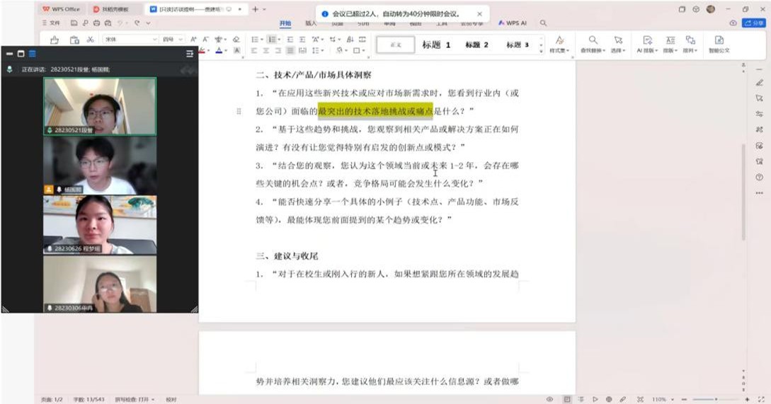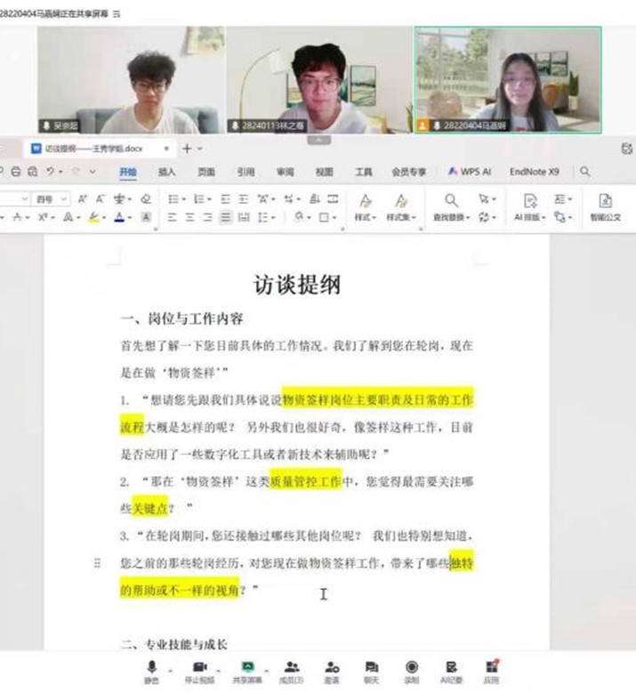 同時,學院協助實踐團隊與今世緣搭建高效溝通渠道,提前對接嘉賓崗位特性與時間安排,并結合三位從業者的領域調整提綱:生產崗側重“工藝標準化”“基層鍛煉模式”,研發崗聚焦“新酒飲市場數據”“技術創新方向”,質量管控崗圍繞“國標要求”“實操風險點”優化問題,保障內容契合崗位實際。團隊提前做好騰訊會議測試、記錄分工、設備調試等準備,確保訪談順利進行。