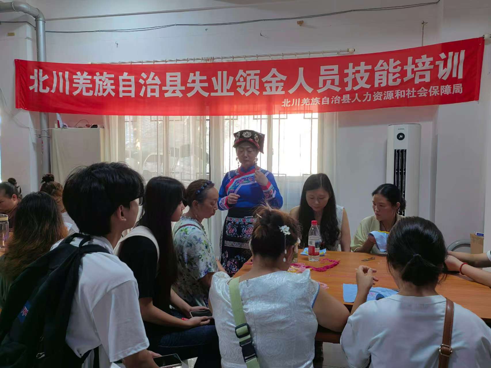 實踐隊首站來到省級非遺傳承人陳云珍創辦的云珍羌繡工作室,隊員們在此親身體驗學習羌繡制作,感受到羌繡技藝的獨特魅力。在繡娘工坊,隊員們與殘疾人繡娘展開深度交流,并參加了北川縣政府舉辦的失業領金人員技能培訓會。
