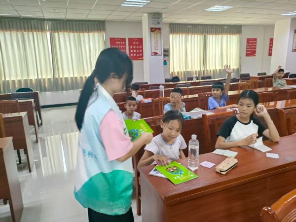 圖為實踐隊向小朋友們發放科普書籍。郭雅蘭 供圖