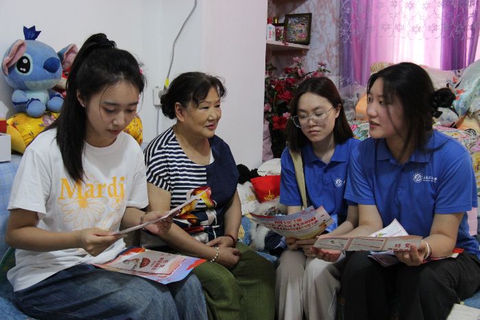 知識普法入戶,法律飛入百姓家。7月6日,實踐團來到北川幸福小區,聯合當地司法所開展“法潤羌鄉”活動。隊員們挨家挨戶發放《環境保護法》宣傳手冊、講解《婦女權益保護法》,讓國家政策飛入尋常百姓家,除此之外,還結合案例向居民講解無人機配送、航空植保等新技術如何改變生活,并針對老年人重點普及“防范航空詐騙”法律知識。