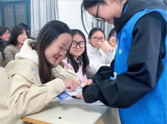 圖為志愿者為同學挑選“中核”趣味貼紙。 劉紫怡 供圖