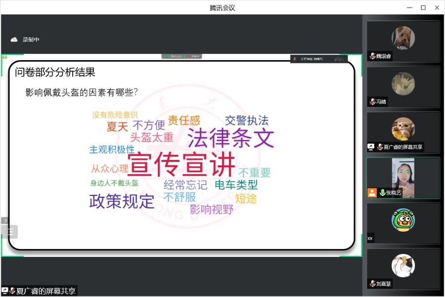 “一盔一戴,安全出行”主題宣講活動于晚上7點準時開始。正式開始前,張曉藝向參會同學介紹團隊成員并提供聯系方式。第一部分是問卷分析結果,張曉藝介紹了影響高中生佩戴頭盔的因素有宣傳宣講、主觀積極性等。是否聽過頭盔宣講對是否佩戴頭盔有重要作用,因此,團隊對高中生開展頭盔安全宣講是有必要的。