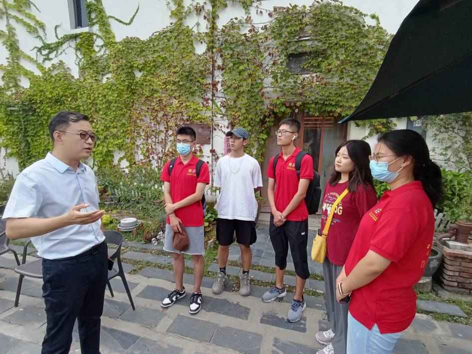 團隊成員合影 8月17日,實踐團在駐村第一書記張偉的帶領下抵達桃源村的山南頭,山南頭作為桃源村的一個自然村,有著許多具有桃源村特色文化的風景。在這里,隊員們見到了既見桑梓民宿的主人殷文律。鄉(xiāng)村振興,振興的不只是鄉(xiāng)村產(chǎn)業(yè),鄉(xiāng)村文化也是重要的一環(huán)。因此,殷總選擇了桃源村作為他創(chuàng)業(yè)的第一站,桃源村不僅有歷史悠久的桃文化,還與殷總追求的野趣不謀而合。在積累了15年的酒店管理經(jīng)驗后,殷總希望將一種小而美的民宿做成可以推廣的商業(yè)模式。懷著這種夢想,作為外來投資人的殷總走進了這桃果飄香的桃源村,將這里作為了夢開始的地方。