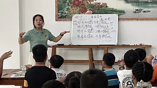 朗朗誦讀聲,千載詩與情。一語一情,《詩經》將萬千世事蘊蓄為字;一腔一韻,吟誦將紙上之字活化為音。8月4日14時40分,青燁隊開設了詩經吟誦課,旨在引領學生進一步了解詩經吟誦,感受中華優(yōu)秀傳統(tǒng)文化魅力。本課程共開設兩課時,由文教組“橙子姐姐”——尹成湘擔任主講員,為大埔村2-6年級的學生帶來精彩豐富的授課內容。
