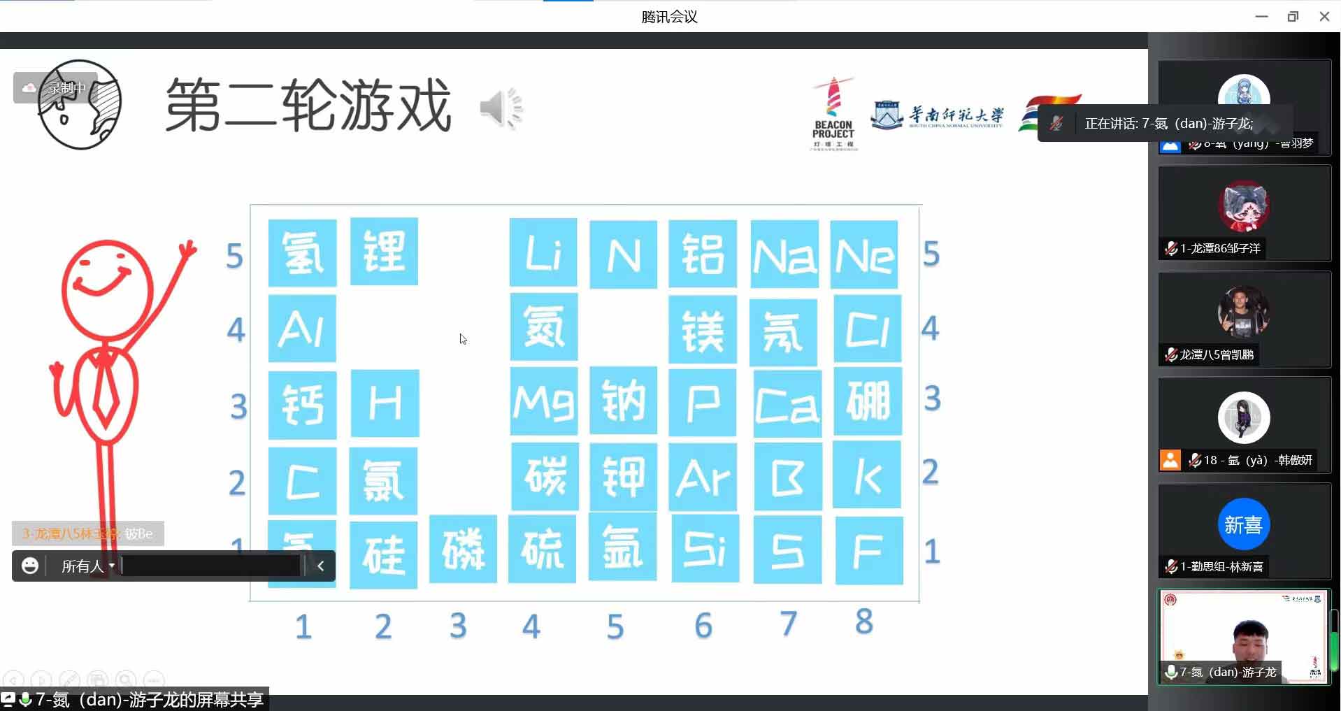 游戲化學(xué),寓教于樂。將游戲與化學(xué)知識(shí)相結(jié)合,以創(chuàng)新游戲理念普及化學(xué)知識(shí),是本次夏令營(yíng)線上課程的亮點(diǎn)之一。游戲化學(xué)課程之一《元素連連看》的三位授課老師帶領(lǐng)同學(xué)們學(xué)習(xí)元素周期表,開啟化學(xué)世界的大門。授課老師用“故事記憶法”、“讀字讀半邊”、“聯(lián)想記憶法”的小技巧幫助同學(xué)們記憶化學(xué)元素的中文名稱讀法,而后進(jìn)一步學(xué)習(xí)這些化學(xué)元素的性質(zhì)與特征來(lái)加強(qiáng)記憶,最后通過(guò)簡(jiǎn)單的連連看游戲,將元素中文名稱與符號(hào)一一對(duì)應(yīng)消除,檢驗(yàn)學(xué)習(xí)效果,讓同學(xué)們?cè)跉g聲笑語(yǔ)中掌握了化學(xué)知識(shí)。寓教于樂是教育活動(dòng)的最高境界,以情施教、情知交融、以樂助學(xué),可以使教育活動(dòng)收到事半功倍的效果。