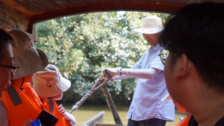 7月28日上午,調研團來到彭村新天地。從磨盤山濕地公園入口進入,泛一葉輕舟,在丁廣運河上行向曲徑通幽處。河道兩邊樹林陰翳,水面平靜無紋。中途,廣德市新天地農旅發展有限公司旅游部王文主任上船向團隊成員講解丁廣運河。運河位于磨盤山,至于為何得此山名,王文主任解釋道,其實磨盤山并非山,而是一片島,這與當地人口語有關。上世紀50年代有一個政策叫“誰開荒誰耕種”,村民習慣將“到開荒過的土地去”稱為“上山去”,以前村民大多種植桃樹,故也稱為桃山。