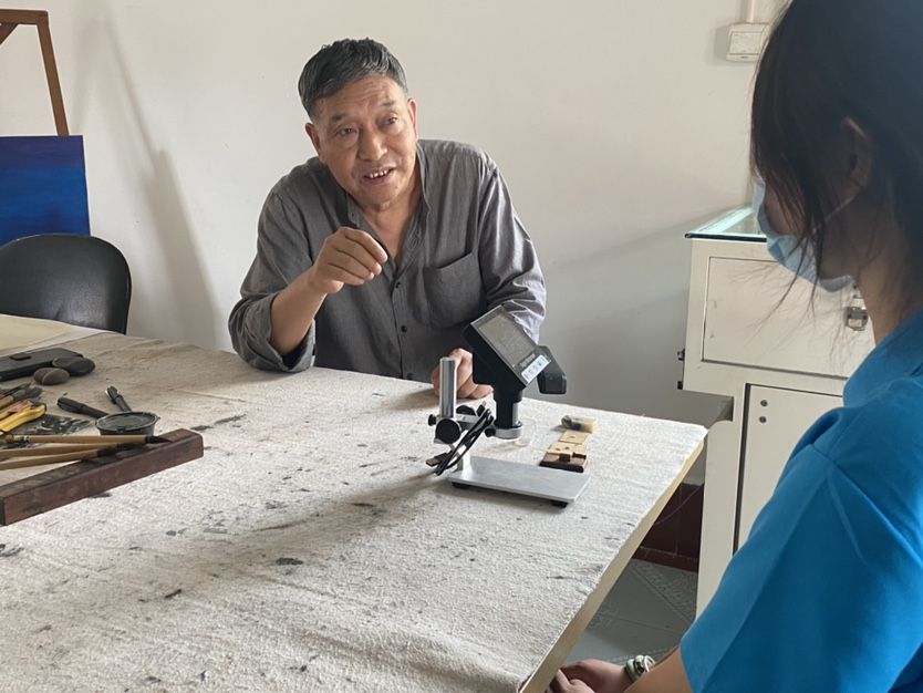 (冉隆泉先生對實(shí)踐團(tuán)成員講解微雕細(xì)節(jié) 張悅/攝)