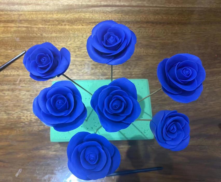參觀完面塑老師的工作室后,實(shí)踐團(tuán)成員們通過對(duì)王之勇老師的采訪,對(duì)面塑的認(rèn)識(shí)逐漸深入,不僅現(xiàn)場(chǎng)觀摩了老師制作面塑的過程,而且在王之勇老師的指導(dǎo)下現(xiàn)場(chǎng)制作了一朵面塑玫瑰。“先將準(zhǔn)備好的面塑面團(tuán)取一小部分揉成橢圓形,按壓在準(zhǔn)備好的棍子上,在將剩下的面團(tuán)由小到大的長(zhǎng)圓臺(tái),等距離的剪成15個(gè)小段并揉成圓形。”王之勇老師耐心的指導(dǎo)著,“再由小到大將15個(gè)面團(tuán)趕車圓片邊薄里厚的貼在花心的桿上一層三片,前三成花瓣高度逐漸升高,適當(dāng)外翻成開花的效果,第四五層與第三層登高并外翻花瓣......”