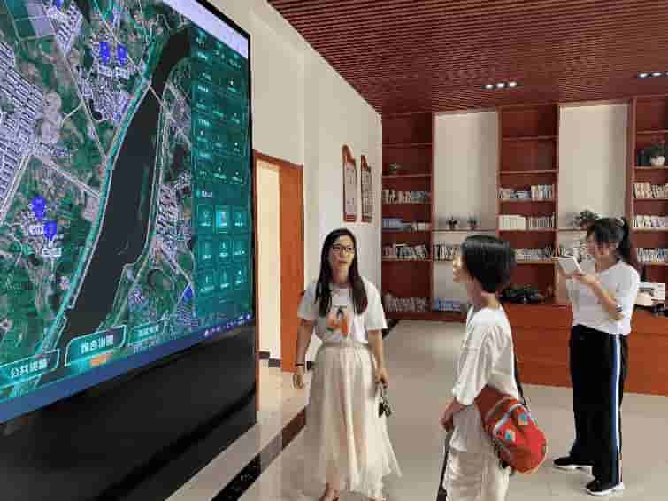 進行訪談隨后,團隊一行人來到城關鎮竹林社區黨群服務中心進行深入了解。竹林社區黨委委員胡女士為我們介紹了“云上竹林”配備的“數字鄉村一張圖”,此圖將智慧黨建、便民服務、村務公開、重點人員管理、環境衛生監管等多種服務融為一體,并輔之以監控的手段實時監測人臉和車輛等信息。除此之外,社區還設置了防溺水與森林防火災報警系統,為留守老人配備了智能手環,以此滿足竹林社區村級綜合治理、平安鄉村建設的要求。