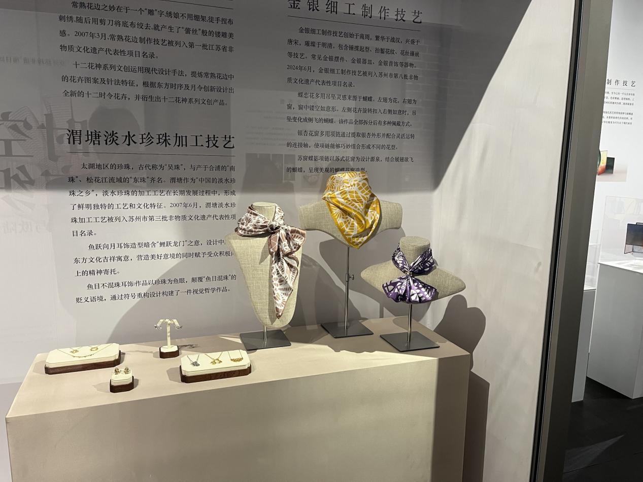 而當古今文化碰撞勢必會創行。在展館內,渭塘淡水珍珠加工技藝等非遺項目的展示令人眼前一亮。太湖地區的珍珠自古有名,渭塘作為“中國淡水珍珠之鄉”,其加工工藝獨具特色。展臺上,珍珠飾品搭配絲綢方巾,將珍珠溫潤與絲綢絢麗融合。一旁展板,詳述常熟花邊 “雕” 字訣等技藝傳承,從傳統刺繡到文創產品,展現非遺在現代設計助力下的創新,讓古老技藝煥發新活力,傳遞著獨特的文化魅力 。