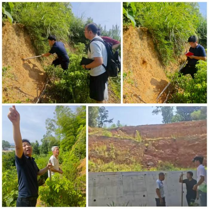 在李德營教授的帶領(lǐng)下,團(tuán)隊(duì)聚焦具體地質(zhì)災(zāi)害風(fēng)險區(qū)開展了詳細(xì)調(diào)查。上午,團(tuán)隊(duì)前往天城鎮(zhèn)謝家坳村金阿姨家房屋切坡進(jìn)行實(shí)地調(diào)查。李老師現(xiàn)場親自指導(dǎo)成員們進(jìn)行調(diào)查工作,大家認(rèn)真地調(diào)查邊坡形態(tài)、規(guī)模、坡度、斜坡結(jié)構(gòu)、地層巖性、巖土體強(qiáng)度、邊坡變形等情況,繪制了工程地質(zhì)剖面圖。同時,成員們還與村民親切交流,詳細(xì)詢問房屋的建設(shè)時間、經(jīng)歷過的滑坡險情以及汛期邊坡變形特征,為分析切坡建房地質(zhì)災(zāi)害風(fēng)險積累了寶貴的第一手?jǐn)?shù)據(jù)。