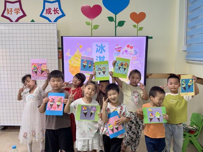 在王家坪紅軍小學,傳統文化與創意表達成為課程的核心。書法課堂上,隊員們手把手指導孩子們練習毛筆字,從橫平豎直的起筆規范到利落有力的收鋒技巧,耐心糾正每一個細節。隨著課程推進,孩子們筆下原本稚嫩歪扭的字跡逐漸變得工整有序,專注的眼神中透露出對傳統文化的濃厚興趣,墨香裊裊間,傳承的種子悄然扎根。手繪課上,隊員們摒棄“標準答案”的束縛,鼓勵孩子們釋放天性——紙上綻放出形態各異的冰淇淋、長著翅膀的星星等充滿童趣的作品,每一筆線條都承載著孩童獨有的想象力與創造力,成為夏日里最生動的注腳。