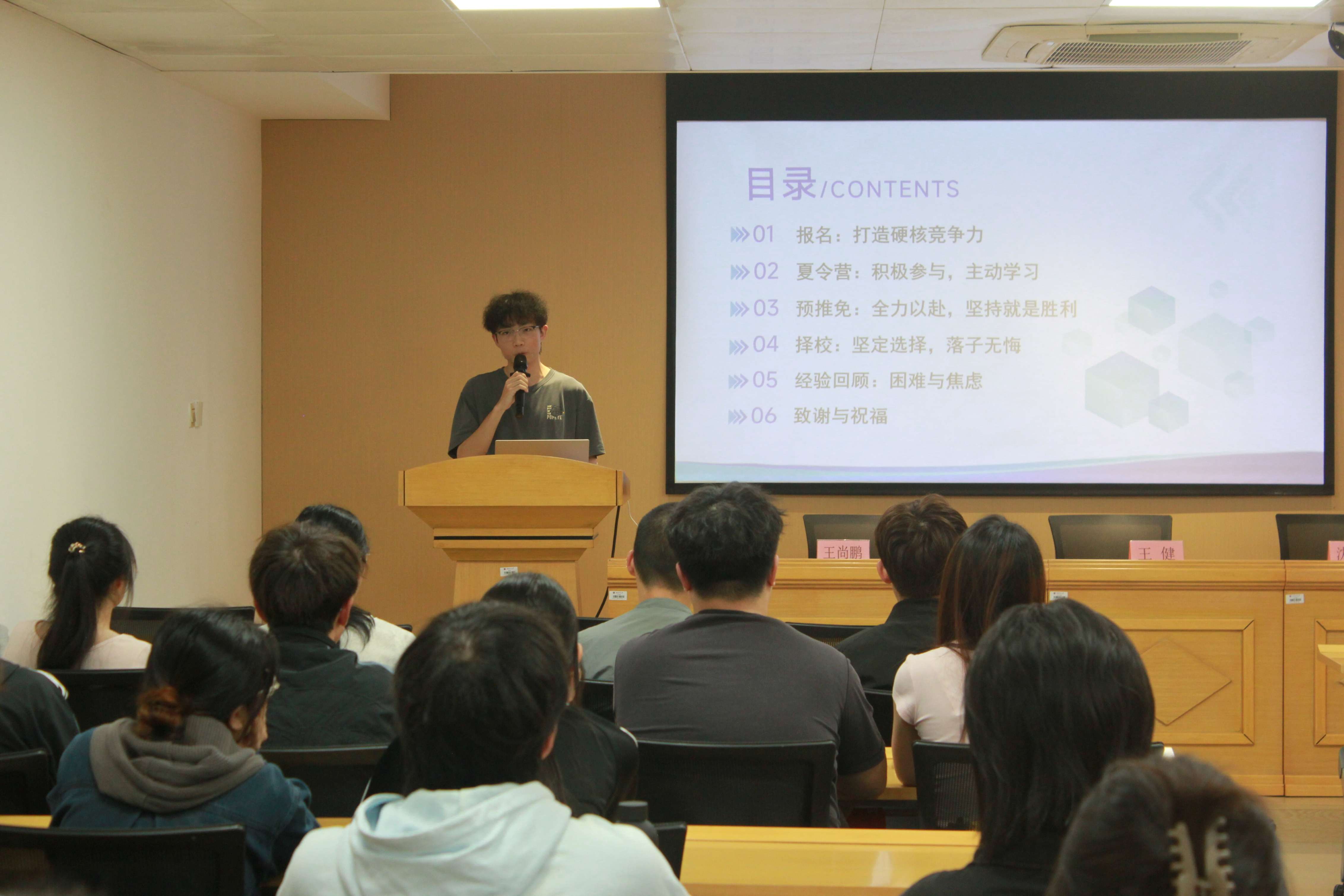 為幫助支部成員深入了解推免流程、提升學(xué)術(shù)競(jìng)爭(zhēng)力,福建師范大學(xué)數(shù)學(xué)與統(tǒng)計(jì)學(xué)院2023級(jí)數(shù)學(xué)與應(yīng)用數(shù)學(xué)專業(yè)實(shí)驗(yàn)班團(tuán)支部于2025年10月22日在理工南樓201教室舉辦了主題為“楷型垂范昭邇遐,青衿承風(fēng)赴遠(yuǎn)涯”的推免經(jīng)驗(yàn)分享會(huì)。活動(dòng)邀請(qǐng)了多位成功推免的2022級(jí)同學(xué),他們結(jié)合親身經(jīng)歷,分享了推免過程中的關(guān)鍵問題、挑戰(zhàn)與成功經(jīng)驗(yàn),提供了寶貴的指導(dǎo)和實(shí)用建議。