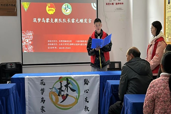 會議伊始,赫章縣騰龍社區(qū)包村干部謝峰致辭,謝峰對不遠(yuǎn)千里來到六曲河鎮(zhèn)騰龍社區(qū)開展支教活動的筑夢烏蒙支教隊(duì)表達(dá)熱烈的歡迎與真摯的感謝。接著,他對騰龍社區(qū)的發(fā)展歷史進(jìn)行了簡要介紹,“五九六九隔河看柳”,并表示支教隊(duì)的到來對騰龍社區(qū)來說仿佛春天已經(jīng)到來。最后,謝峰對參與學(xué)生提出要求,希望學(xué)生們能夠珍惜此次活動的寶貴機(jī)會,在短暫的支教生活中和支教志愿者老師們玩得開心、學(xué)得開心。接著,家長代表王萍發(fā)言,王萍對社區(qū)村委會、筑夢烏蒙支教隊(duì)對活動的精心組織、無私奉獻(xiàn)表達(dá)衷心的感謝,表示全體家長一定會積極配合,共同助力孩子學(xué)習(xí)與成長,相信在大家的共同努力下,活動一定會取得圓滿成功,孩子們也一定會在這里度過一個(gè)快樂的假期。隨后,學(xué)生代表王愛、黃群進(jìn)行發(fā)言,學(xué)生們懷揣著對知識的渴望、對未來的憧憬,將在這里開啟一段新的旅程。感謝每一位志愿者老師對學(xué)生的付出,也期待在這里學(xué)到知識、開闊視野、增強(qiáng)自信、有所收獲、有所成長。