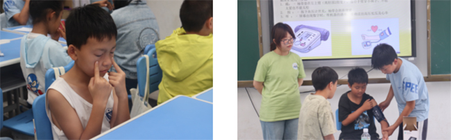 7月11日,實(shí)踐團(tuán)成員示范標(biāo)準(zhǔn)眼保健操六節(jié)手法,學(xué)員分組互評(píng)確保穴位定位準(zhǔn)確。生理課程教授靜息/運(yùn)動(dòng)心率監(jiān)測技術(shù)、血壓計(jì)規(guī)范操作流程。學(xué)員制作《健康監(jiān)測手冊(cè)》,記錄“用眼20分鐘需遠(yuǎn)眺”“定期血壓檢測”等家庭健康管理要點(diǎn)。